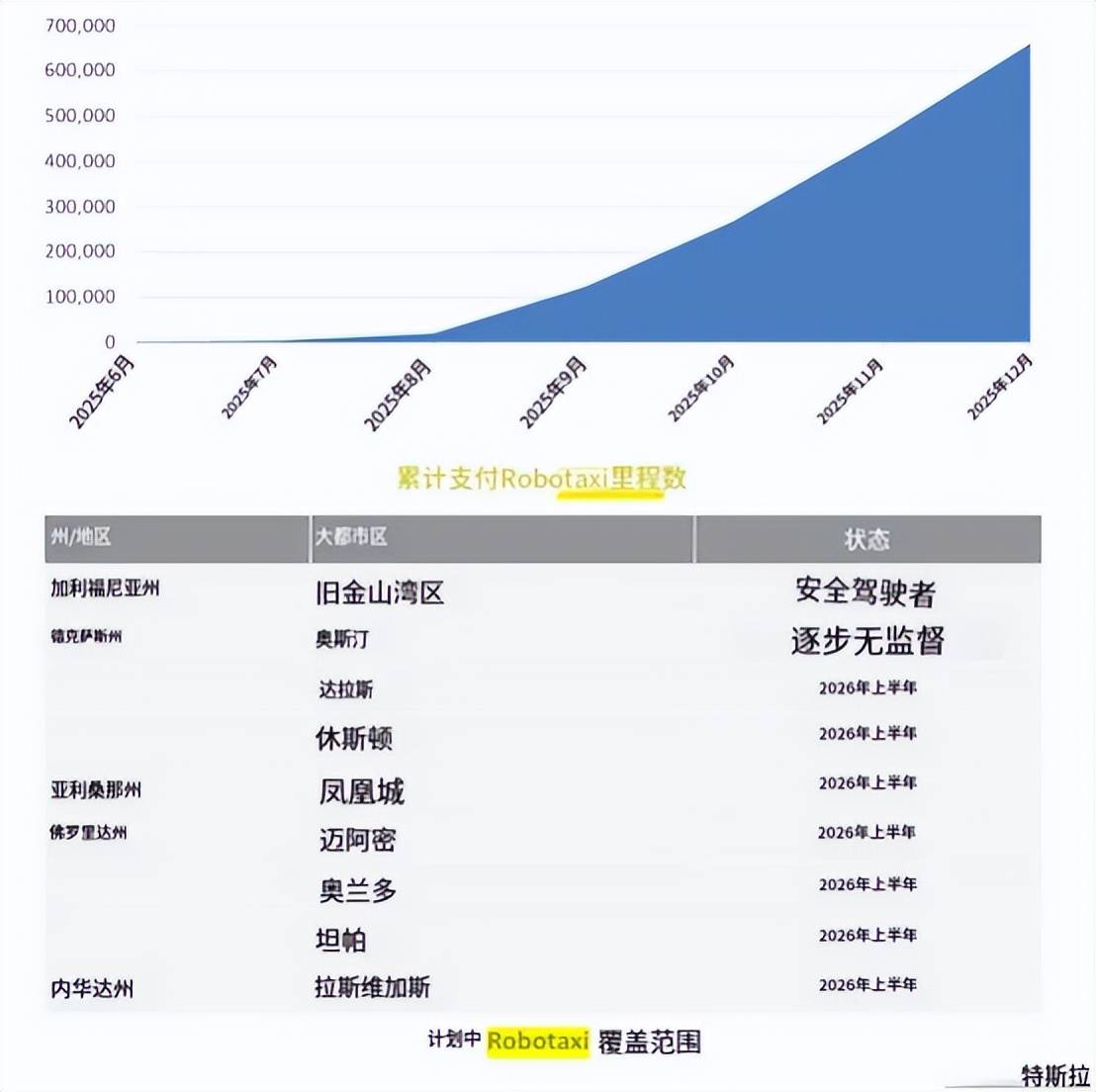 2026年2月,第一辆专为Robotaxi场景打造的Cybercab在得州超级工厂下线,4月启动规模化量产,并于上半年在达拉斯、休斯顿等7座美国城市扩展服务。